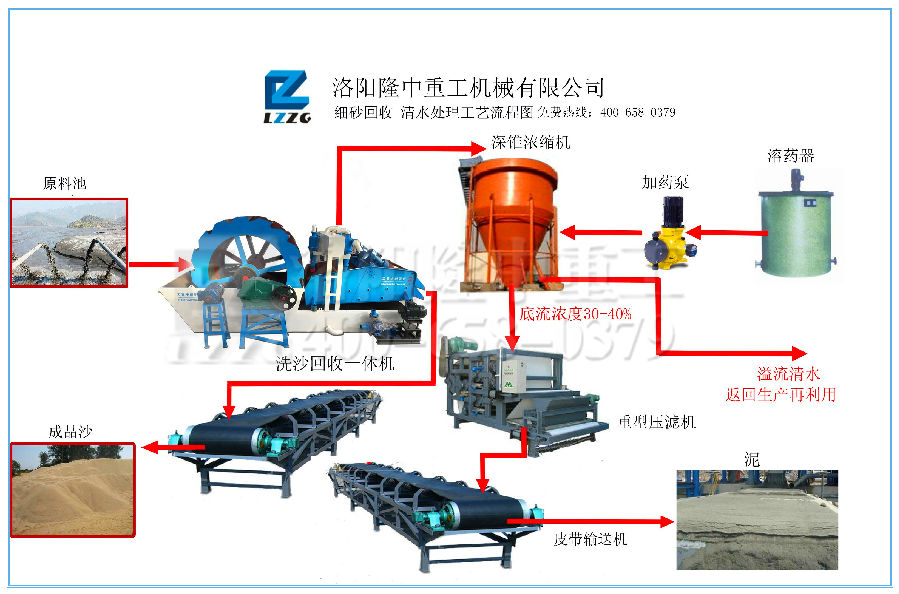 1:原料池通過隆中重工的洗砂回收一體機,洗出的一部分細沙通過傳送帶成為成品砂。另一部分,進入深錐濃縮機,逆流清水重復利用,分離出來的泥土可以回歸耕田種植植被。
