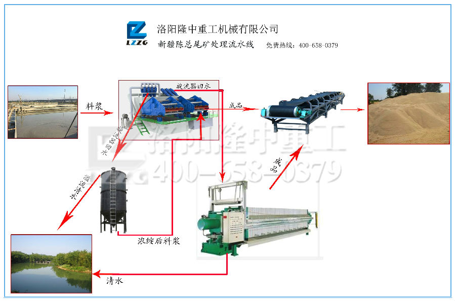 3泥沙分離器+深錐多錐g效濃密機+尾礦干排篩+重型壓濾機+加藥泵+溶藥器+耐磨渣漿泵+輸送帶