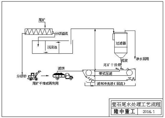 該公司現有一套螢石浮選生產線,日處理300噸品位20-30度螢石原礦。在生產過程中每天產生1200立方尾礦水。該公司的尾礦水長時間靜置后不能澄清,外排會污染環境,尾礦水處理問題已經影響到了公司的正常生產。該公司曾經使用壓濾機處理的辦法,尾礦水先進入沉淀池,加凈水劑后進壓濾機,運行成本高且出水不清、懸浮物含量高,不能回用到浮選上。  我公司根據該公司具體情況制定了下述方案。方案實施后,尾礦水得到凈化并回用于浮選,同時節約了每年10萬元的取水費、減少了浮選藥劑的投加量,干尾砂外售生產建筑材料,避免了尾礦水污染周邊環境,為企業帶來了顯著的經濟效益和社會效益。  根據該公司的生產原料及尾礦水中的成分,使用本方案后c底地解決了尾礦水、泥處理問題。