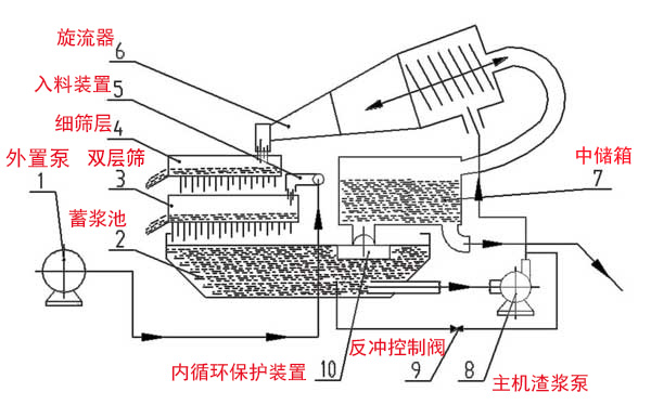 3、旋流器6所分離出的廢渣則通過其底流口排出,進入振動篩細篩層4上,通過其篩振實現(xiàn)對廢渣的脫水并最終排除。